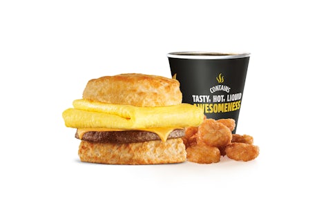 Grilled sausage, folded egg, American cheese on a buttermilk biscuit. Served with Hash Rounds® and a Coffee. Breakfast served until *10:30am (*Hours may vary by day)