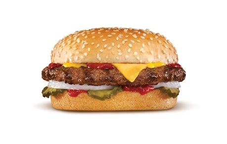 Charbroiled all-beef patty, melted American cheese, pickles, onions, mustard and ketchup on a seeded bun.