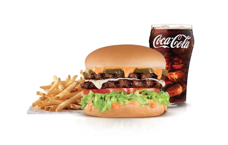 Two charbroiled all-beef patties, Pepper Jack cheese, pickled jalapeno coins, Santa Fe Sauce, lettuce and tomato on a plain bun. Served with Fries and a Soft Drink.